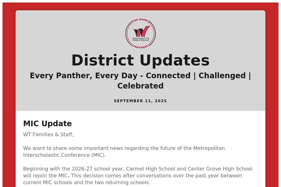 District Updates Every Panther, Every Day - Connected | Challenged | Celebrated September 11, 2025 MIC Update WT Families & Staff, We want to share some im. . .